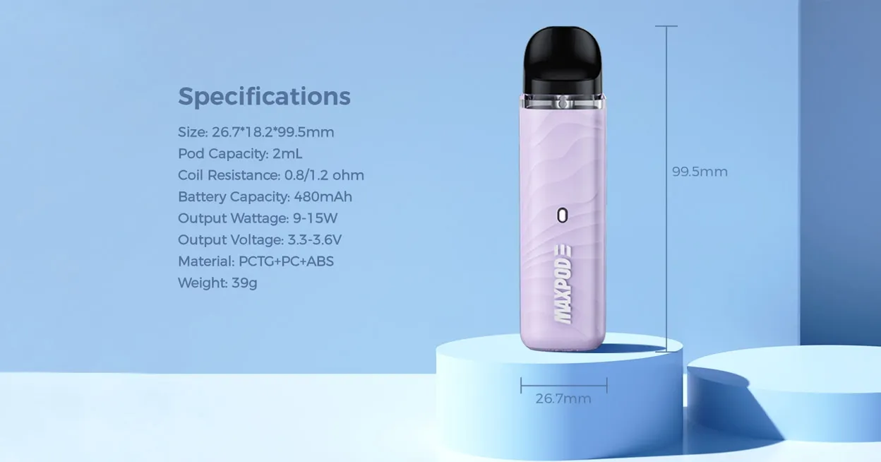 Comes with a 2mL refillable pod with an integrated coil and a rechargeable 480mAh battery with a USB Type-C port, which is a draw-activated pod system. It currently comes with 0.8ohm or 1.2ohm mesh pod that adopts the child-resistant top-fill design, super safe and convenient to use.