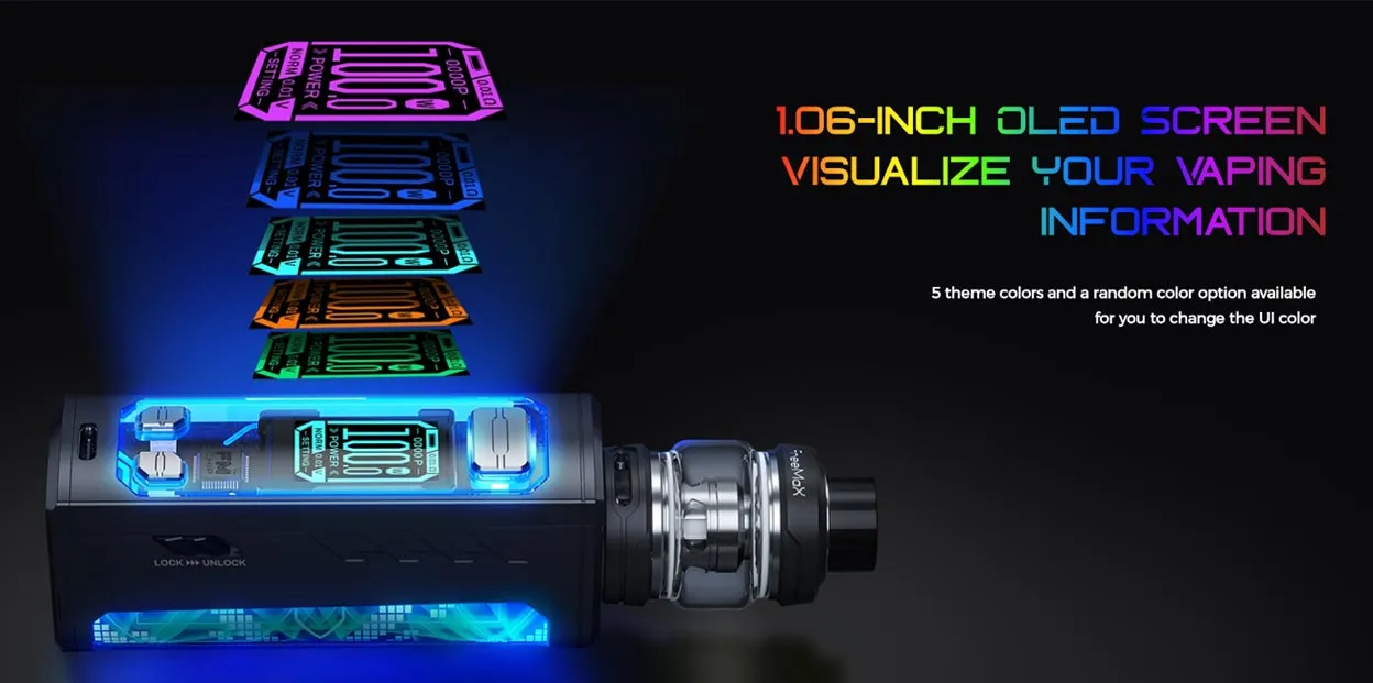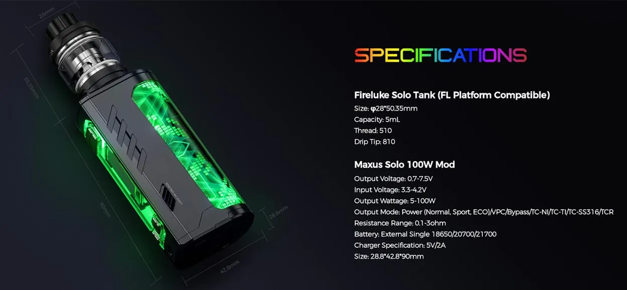 Kit consists of Fireluke Solo Tank and Maxus Solo 100W Mod, powered by an external 18650/20700/21700 battery and charged with a 5V/2A USB Type-C cable. It has a cool mood lighting design that will attract lots of attention no matter whether it’s day or night. Besides, this mod also features FMOS 3.0, FM CHIP 3.0, a 1.06-inch OLED screen, multiple output modes, and a slide switch, powerful enough to enhance your vaping experience.