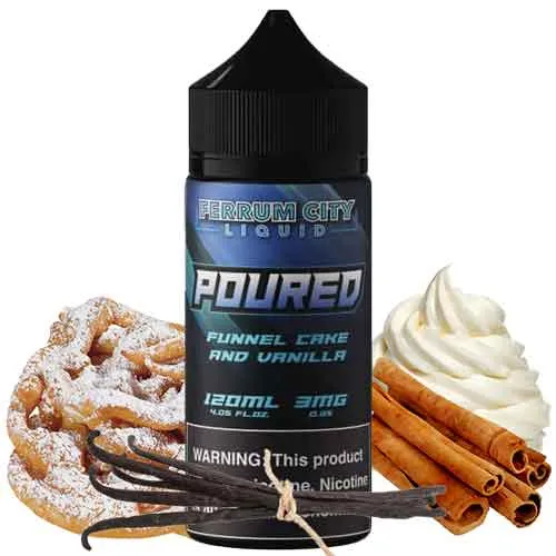 Poured 120ml – Ferrum City, a sweet funnel cake topped with decadent vanilla whipped cream, and sprinkled with cinnamon, and sugar! In creating this flavor, Ferrum City went to great lengths to capture the taste of funnel cake’s crispy brown exterior as well as its light, airy interior!